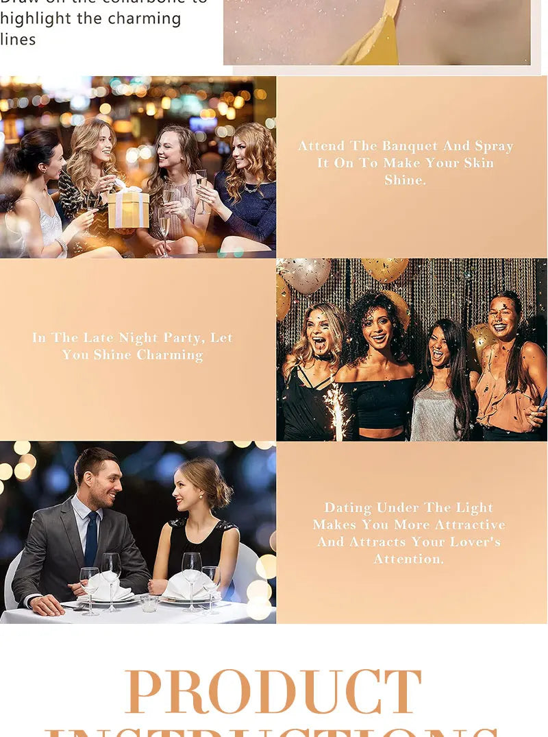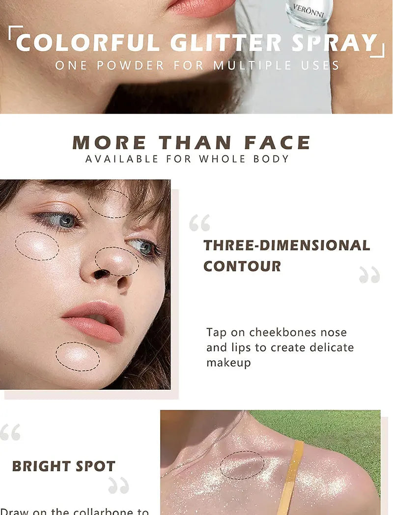 Shine bright from every angle with this diamond shimmer highlighter spray, featuring 6 dazzling colors for face and body. Its fine mist delivers an even, luminous glow that’s waterproof, long-lasting, and perfect for contouring or adding sparkle to any look.