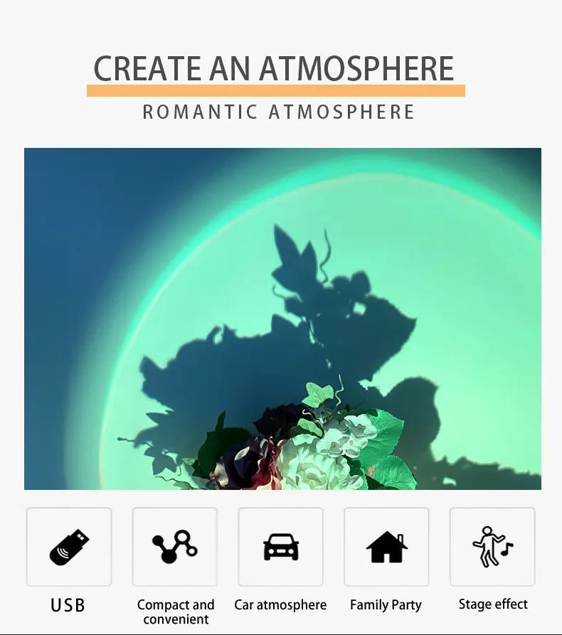 Create stunning atmospheres with this Sunset Projection Lamp, designed to cast dreamy rainbow and sunset-like glows onto your walls. Perfect for bedrooms, photography backdrops, or mood lighting, it’s USB-powered for convenience and built with durable ABS material for long-lasting use.